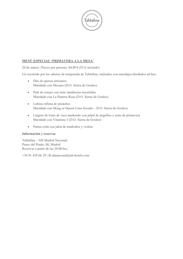 El próximo 20 de marzo, coincidiendo con la llegada de la primavera, Tablafina el espacio gastronómico del hotel NH Madrid Nacional da la bienvenida a la nueva estación con una propuesta efímera concebida para disfrutarse sin prisas.